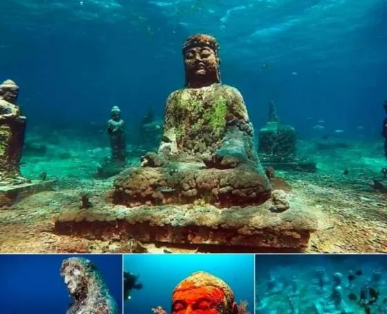 水下的这些坐像叫海底佛像,表面长了青苔和珊瑚,鼻梁和手指都被海水磨圆了,周围小鱼一阵一阵地拐过来,阳光从水面一层层压下来,像给它们披了薄纱,小时候在书上看海神庙,脑子里一直是飘忽的影子,这张让我第一次觉得海也能把寺院收在怀里。