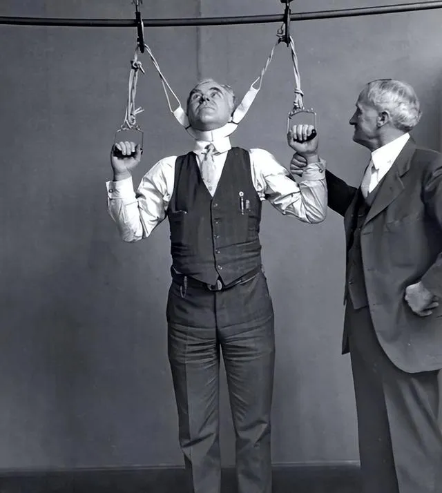 两条吊带从头顶垂下来,男子把手扣在把环上,脖子被硬质的圈托住,旁边的人穿着马甲盯着看,这玩意儿叫拉伸装置,据说能把身高拉高几公分,听着就让人打怵,脖颈这么细嫩的地儿经不得折腾,放在现在估计早被健身房劝退了。
