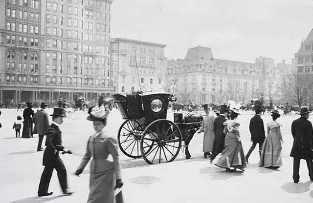 这条宽街是第五大道,马车还在路中间慢慢挪,行人的帽檐压得低,裙摆在风里打圈,远处楼体线条干净,窗子一排排齐着站,照片把城市按下暂停键,噪音没了,只剩下脚步和轮子压在雪面上的痕迹,以前逛街得看马,现在我们过马路得看手机。