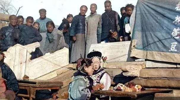 图中这两位穿花缎披云肩的叫贵族妇人,髻上压着亮汪汪的头面,簪花打得扎眼,桌面上堆着果脯点心,碟口薄得发亮,背后挤着一圈看热闹的壮汉和小子,像集市边上临时支起的茶摊,阳光一打,绸缎的光泽往外泼,跟后头人群的灰布蓝棉一对照,更显得突兀而体面。