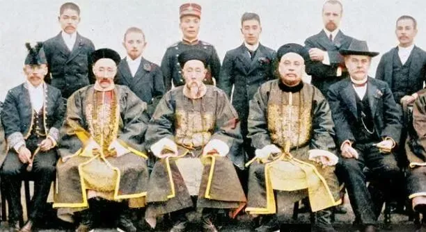 这个大合影叫江汉关工作人员合影,排在前头三位是朝服蟒补长袍,后头一排夹着洋装黄呢军帽,胡子有卷的也有直的,领口别着小花,像是庆功也像是留影纪念,椅子腿儿细长,摆得端端正正。