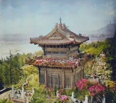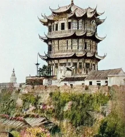 清末彩色老照片:两个被围观的贵族妇人;江汉关工作人员合影;黄鹤楼;乾隆时期的铜亭。