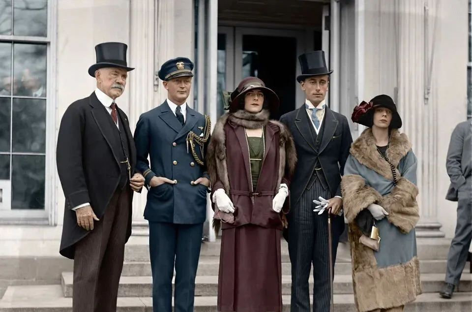 图中这身行头叫典礼装,丝呢礼服配高顶礼帽,肩章金穗在阳光下发亮,女士们裘皮披肩一搭,珠链手套一配,镜头里都是讲究人,这种站姿挺拔得像被细线牵着,下颌略抬,眼神不躲不闪,像在对镜头说请按下快门吧,我准备好了,外人看是排场,懂的人看门道,袖口的扣、怀表的链、手杖的头,全是细节与规矩。