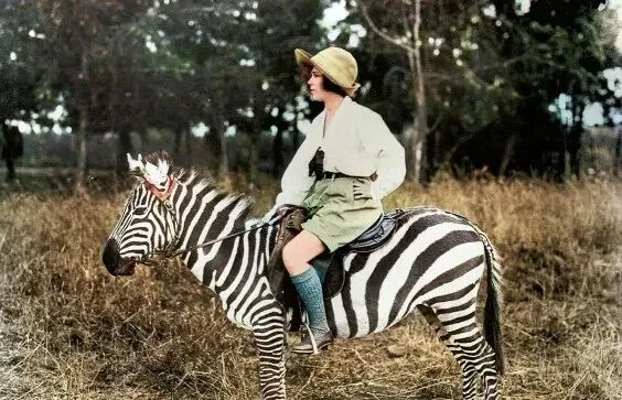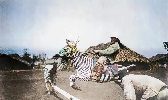 这个条纹家伙叫斑马,皮毛像刷了黑白钢琴键,漂亮是漂亮,脾气可一点不小,照片里有人把缰绳攥得死紧,腿夹着肚带还不保险,它说蹿就蹿,说拧就拧,驯马的一套到了它身上就不太管用,奶奶看见这张笑了,说这玩意儿不好使,爱踢人,耳朵一别就要闹腾,你看那张被掀翻的,帽子飞了,人还在半空,拍的人估计手都抖了,那会儿的人真敢试,现在我们讲动物福利讲科学驯化,不会这么硬来啦。