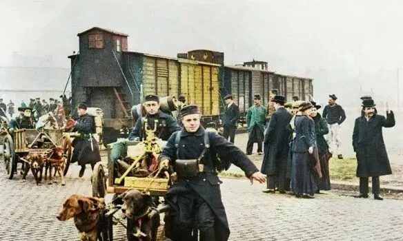 画面里这套组合叫犬车,粗壮的狗套在挽具里,前杠连着小木车,车上码着箱子和铁皮桶,士兵手里还抓着缰绳,跑起来轮子一颠一颠的,咔啦咔啦直响,爷爷看新闻片时说过,战时什么都紧张,能拉一趟是一趟,狗认路还耐力足,等和平了它们就退场了,这个职业也就留在照片里了。