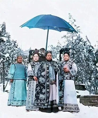 这把巨大遮物叫油纸伞,颜色亮得出奇,伞柄顶在侍从的肩窝里,几个人站在雪地里,衣袍的纹样一层叠一层,脚下的雪被踩得实实的,咯吱咯吱的声音都能想出来,那会儿出门讲究排场,寒风里也要把面儿撑住,奶奶说冬天最怕的是手背裂口子,袖里总揣着一小块香油膏,拍照时还要悄悄抹一抹,看着就体面。