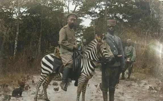 这张更直白,图中坐骑还是斑马,个头不高,鞍子压得紧,旁边的人拎着缰,一前一后护着,路是林间土路,杂草沿着边线窜着长,阳光从树缝里一条条落下来,这样的小道我也走过,鞋底沾泥,得在石头上蹭两下才干净,现在大家穿越丛林有越野车了,方向一打就过去了,当年的脚底板才是导航。