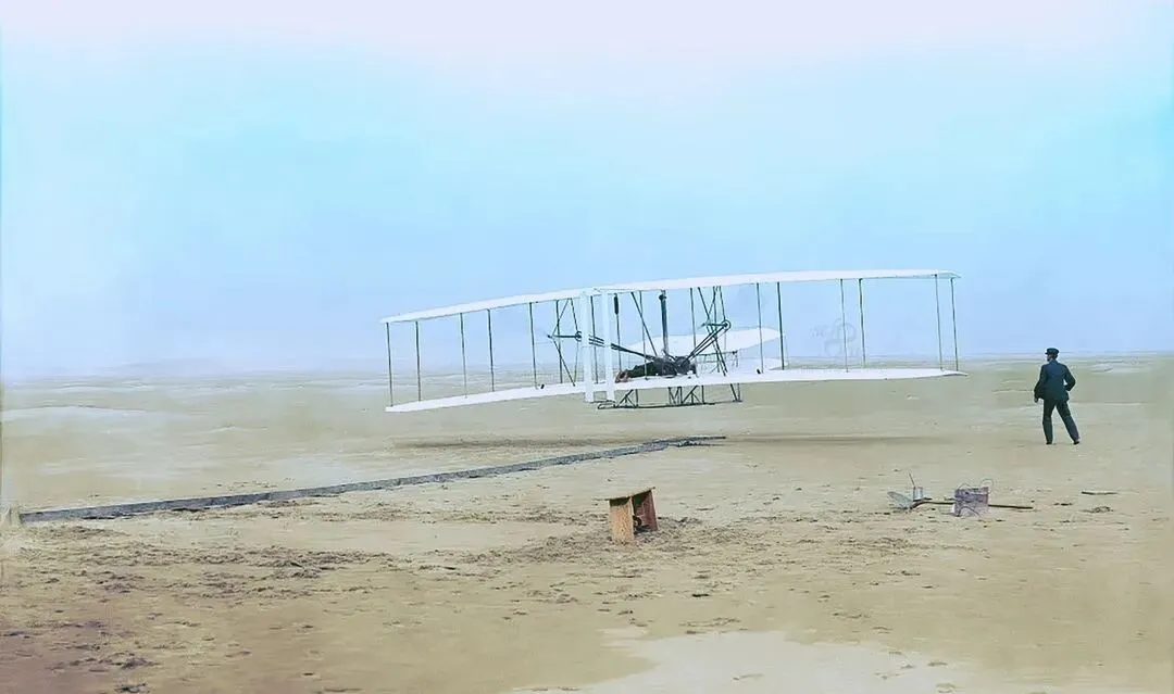这架白骨架叫早期飞机,机翼是绷紧的布面,桁条像一排排干净的肋骨,沙滩上放着简陋的滑轨,风一来,整架子就扶摇起来了,守在一旁的人身影被吹得斜斜的,妈妈看见这里就感叹说人只要能离地一尺,就敢想飞过海,后来我们坐民航从起飞到落地,一路打个盹儿就到家了,从几秒的悬空到十几个小时的跨洋,照片和机票之间,隔着一百多年的手汗和心跳。