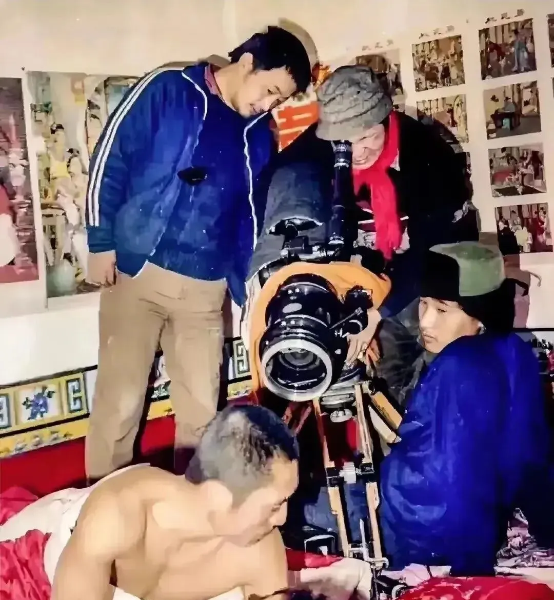 这个片场工作照最有烟火气,军大衣是组里标配,暖壶在桌上,手里一个按住对方脑袋的动作,像戏要开拍前的小默契,冬天拍戏是真冷的,袖口磨得起球了也不在乎,把戏演对了才是头等大事。