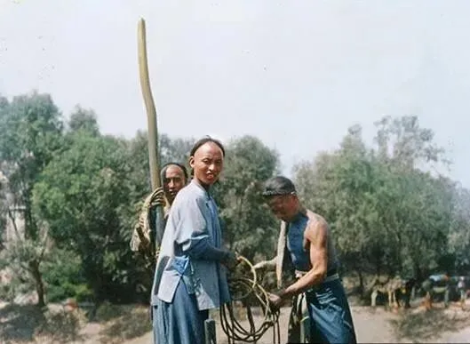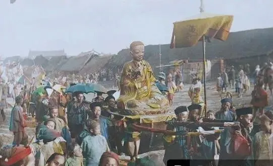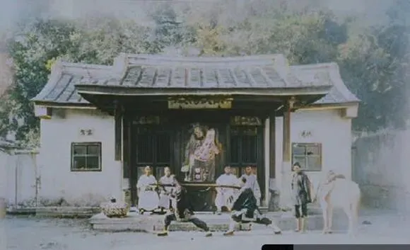 晚清彩色老照片:山东威海露天戏台;农村男子在河边打水;朝廷大臣嫁女儿排场盛大;吸食鸦片双目无神的男子。