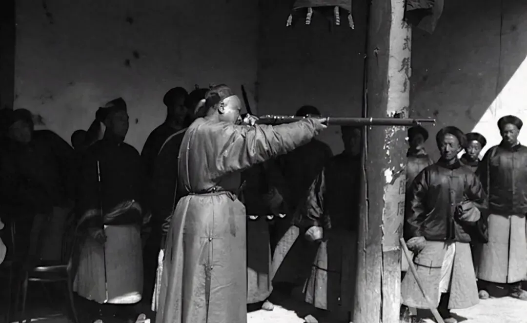 图中长身细管的火器叫前装线膛枪,黑亮的枪管比人还长,木托被汗手磨得发滑,扳机护圈薄薄一片,肩窝一贴就知道是老兵的架势,立姿对柱瞄准,呼吸收紧,周围士兵把手背在袖里看着,谁都不出声,就等那一声脆响落地。