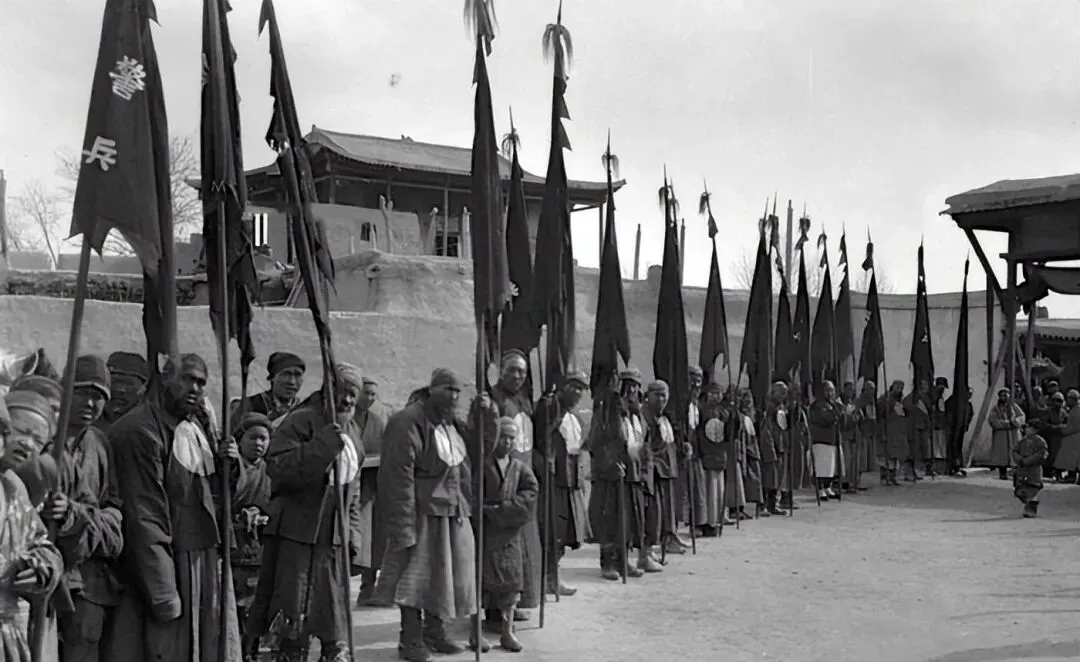 这迎风招展的叫军旗队,旗杆高过屋脊,旗面上大字一丢丢能认出个“营”字,队伍拉得老长,前胸白布圆补是号衣,风一吹,旗边刷刷响,号兵没吹,光站着就有股气势,那时候练兵靠吼声和脚劲儿,现在训练有喇叭有表,节拍更准,可少了点这份糙味儿。
