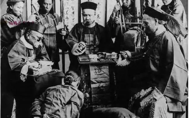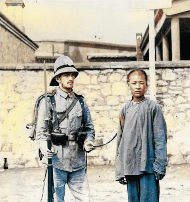 图里这片海滩在福建,队形拉得长,岸边帆影还在,几名跪着的身影被围在当中,旁的人站得紧,帽檐低低,一眼看去海风是冷的,旧朝规矩重,公差喊一声就落定,几十年后我们再看,照片静得吓人。