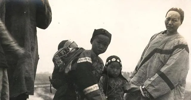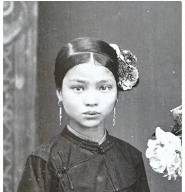 这位小脸巴掌大,头发抹得溜直,耳坠细细垂着,花朵压在鬓边,眼神带点怯也带点不服气,像刚被叫去端茶的样子,外头风大,她身上那层薄棉袄挡不住。
