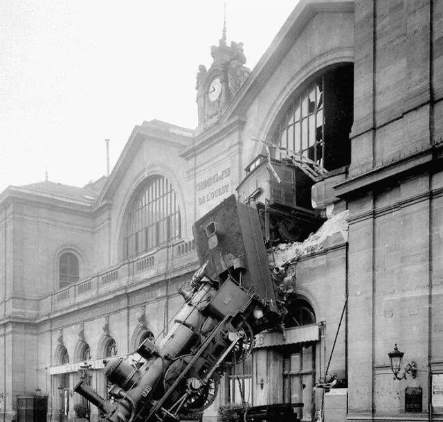 这张异国的相片劲儿大,火车头直接穿楼掉下,立在墙根像一条钢铁瀑布,石头外墙没叫唤却也让人心惊,站前的人影若有若无,意外总是在人松劲的时候拐个弯出来。