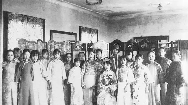 这屋里摆着屏风,女孩们一字排开,衣料发着软光,中间那位簪花坐定,年纪都不大,表情却规矩,奶奶笑说宫里的人相貌不差,可规矩更重,一举一动像被线牵着,现在的婚纱照讲究自由摆,那个时候连笑都要省点力气。