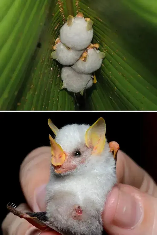 这团白绒是小蝙蝠,叶脉底下挤成一坨,耳朵发亮,个头巴掌大,样子倒像糖球,孩子看见这张直喊可爱,我说别凑太近,野生的东西各有规矩,远远看一眼就好。