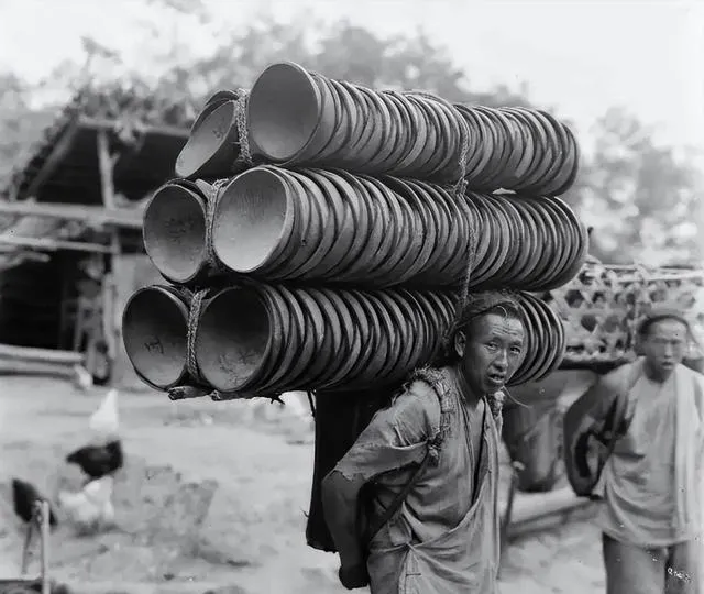 这个家伙叫挑罐的,后背一排排泥罐子,麻绳勒进肩窝,脸上汗顺着土沟流,同行的人在后头招呼一声别急,转个弯罐子就跟着晃一片,爷爷说过去做买卖靠腿,一身力气就是存折,现在货车一趟拉走,肩窝不再起茧子。