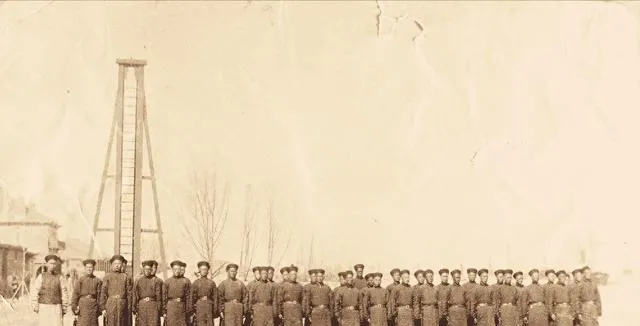 这排人站得齐,帽檐压着眼,旁边那座高木梯像个信号,一声令下就整队进城,脚下是土路,风一刮就起灰,纸面上虽淡,劲头却往外冒。