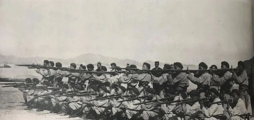 图中这一排持枪的海军水兵,叫步枪队列操法,洋教官口令一落,前排跪姿瞄准,后排立姿托枪,枪口成一条直线,帽檐压得低低的,冬装棉袄鼓鼓囊囊,海风刮在脸上也不眨一下,节奏卡得死准,响动却轻,只有枪机的金属碰撞声清脆一下,训练地背后是秃山和浅海滩,简陋,但精气神在那儿。