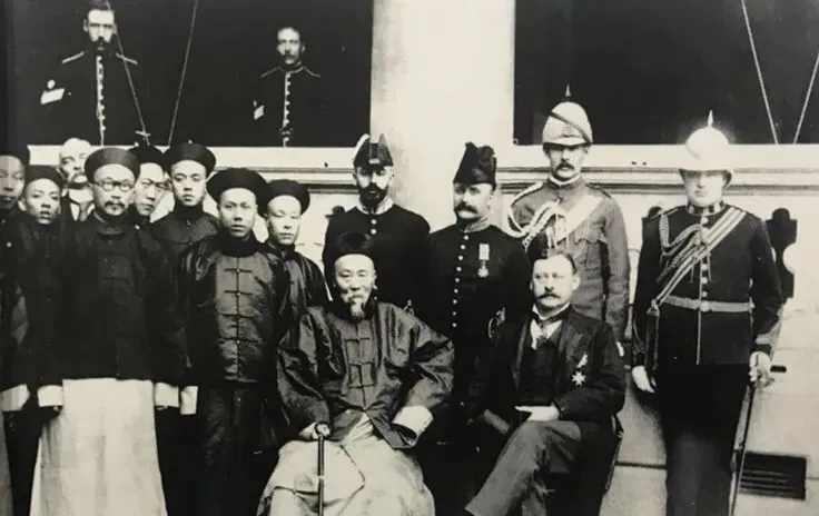 这个场面叫会见港督,正中那位坐着的是大臣,身边一圈洋军官与随从,胸前挂章,肩上流苏亮得扎眼,镜头感很强却不笑,爷爷看过后就说,这就是那阵儿的权力与礼数,离海战也不远了。