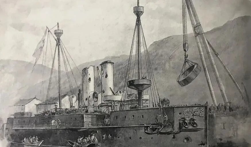 这幅是绘制的修理场景,吊杆挑着钢制圆盖,像把巨大的汤勺,底下是伤痕累累的甲板,工匠在边上忙,木驳挤在舷侧,水里漂着锯末子,谁都没抬头看镜头,修补就是跟时间抢,晚一步,前线就要缺一分火力。