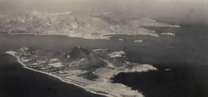 从高空看,这叫岛屿总貌,前端是平坦沙嘴,后面连着几处小山,像一条伏在海里的鱼,海沟深浅肉眼可辨,军港设在背风水面,出防很快,回防也顺,当时选这里做根本重地,确实有眼光。