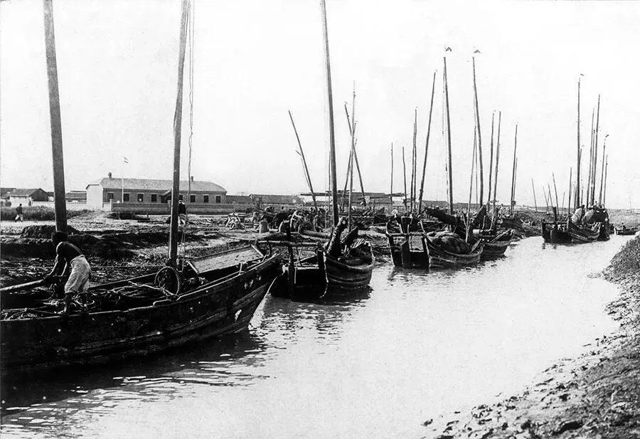 停泊在塔埠头的船,远处可见德国海关。