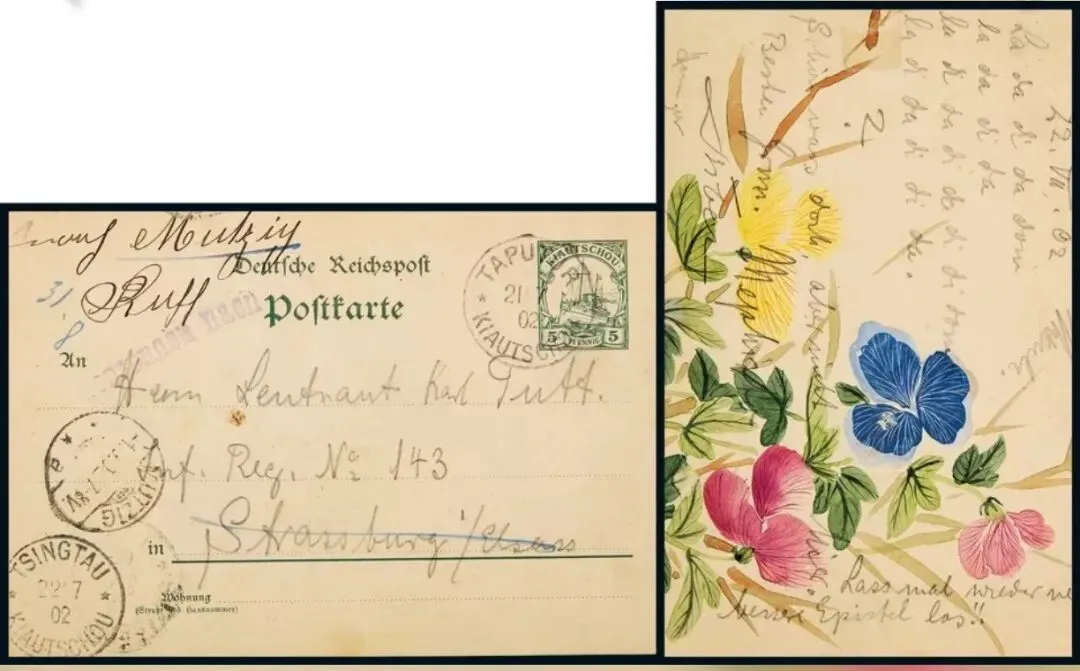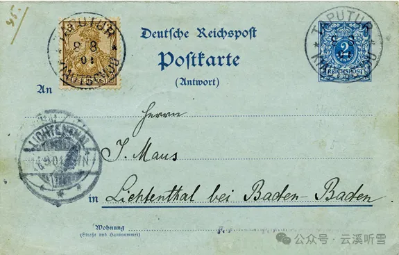 1901年德国邮资片(回片),加贴一枚德王像一分邮票,德国在华客邮局胶州塔埠头,有德国海关人员驻扎。
