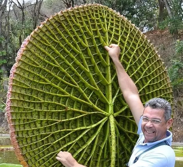 这背面沟沟坎坎的圆盘是亚马逊王莲,叶脉粗得像钢筋一样,手一摸应该是凉而硬的,正是这骨架把整张叶子撑得结实,听园艺师笑说,小孩坐上去不沉底,可别学电影里那样全家上去,规矩还是要有的。