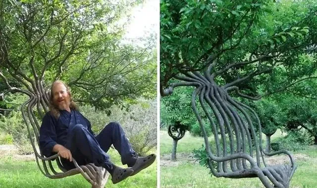 这张照片里的东西不靠锯不靠钉,叫树椅,树枝被耐心地引导着一圈圈长成椅子的形状,八年时间就等它乖乖弯过来,坐上去微微晃,风一吹树叶沙沙的,工夫都在等上头,真是服气。