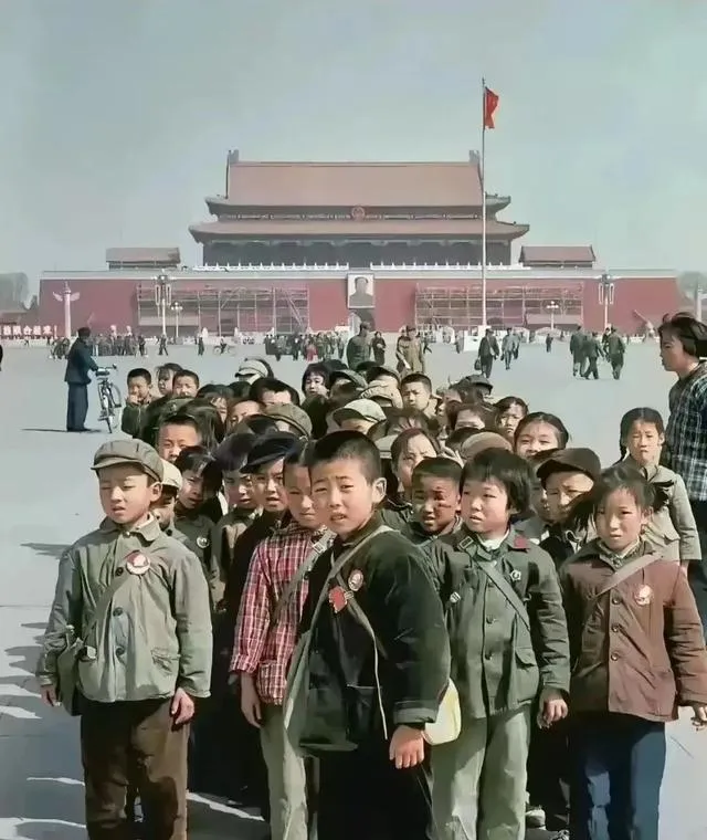 这队伍里的孩子们穿戴朴素,胸前别着像章,脸上是认真又好奇的神气,老师在一边招呼别挤,拍照的人退了好几步才把人装下,那时候出远门是件大事,现在拿手机轻轻一点,照片就能飘回家里了。