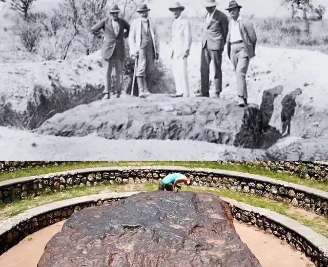 这块黑乎乎的大块头叫霍巴陨石,地球上最大的天然铁块,站在旁边人一下就小了,想象它从天上落下来的声势,附近的土怕是都抖了三抖,现场围了一圈矮墙保护着,游客探着身子摸一下就收手,烫不烫不知道,心里先烫了。