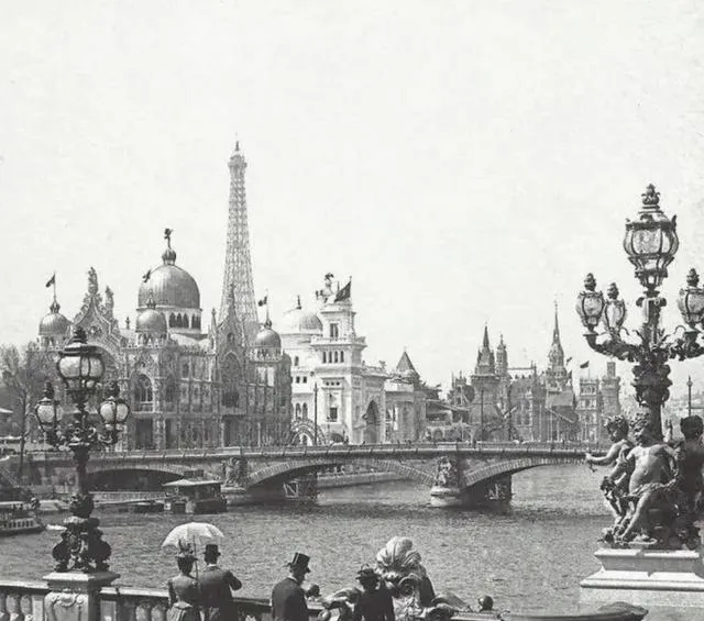 这张是百多年前的巴黎,桥、塔、雕像都在,河面静得像一条缎子,撑伞的、戴礼帽的,步子不赶不慢,一百多年后再去,同一处角度还是那股派头,城市把时间缝得很细,线头都收好了。