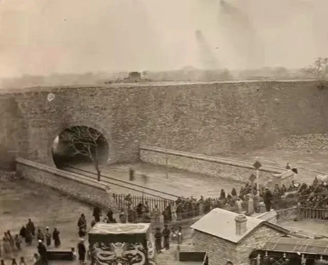 看这城门洞口的人流,里头是有轨电车的线路,杆子顶着电线取电,地面靠钢轨回路,那会儿车过来叮当一声,孩子就跟着跑两步,后来城里换了无轨的,头顶两根杆子晃晃悠悠地走,现在电客车嗡一嗡滑过去,声音小了,味道也淡了。