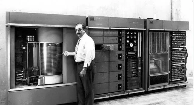 这排大家伙是早期磁盘存储的商用计算机,机柜里鼓着一个个圆盘,工程师拿着小工具站边上,屋里空调温度得压住,不然机器发脾气,想想现在口袋里一块小芯片能装下当年的大屋子,真有意思。