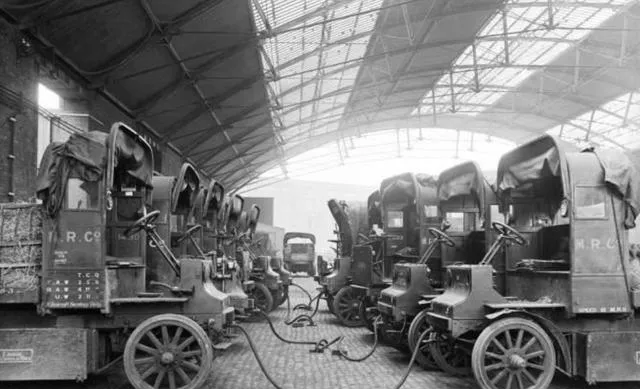 一列卡车鼻子朝里排成排,电缆从壳子里拖出来插在车身上,像在喂奶一样,早年的电车补能办法朴素直接,顶棚上落着尘,工人把帽檐一抬检查指针,点点头就撤了,规矩全在手上。
