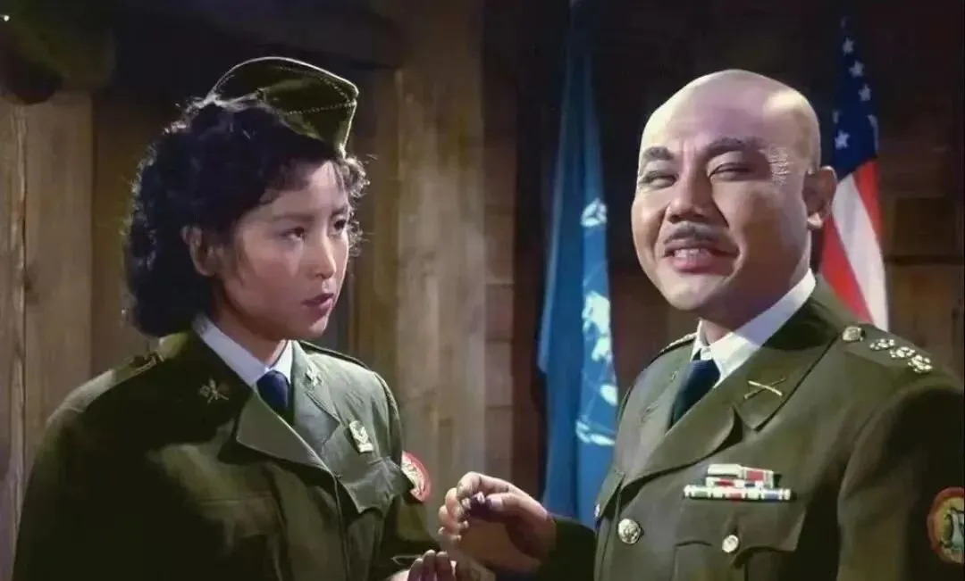 这张颜色鲜,灯打得通透,女军官的眉尖紧,秃顶将领的笑有点虚,他把圆脸一靠,胸口那一排胸章反着光,喜剧里带着寒意,这类角色他接得多,观众一看就懂,笑完心里还是凉的。
