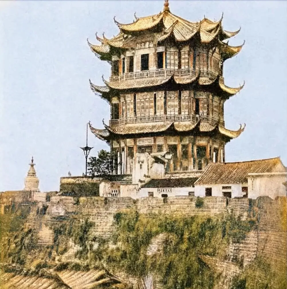 图中这座楼不用多说,黄鹤楼的飞檐一层叠一层,像金色的浪花,墙脚下那一小块绿油油的是菜园,竹篱笆细细扎着,地里分成巴掌大的畦,葱蒜叶子尖上挂着露水,风一吹就闪,奶奶看见这张照片笑我说,你以为古迹只给人看呀,楼下也要种饭菜过日子呢。