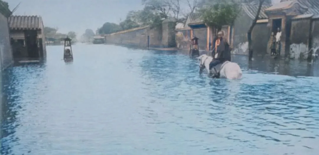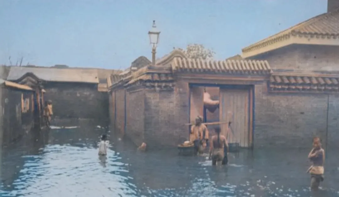 这几张是老北京的水,砖墙外檐被水线刷得一圈一圈的,门楼里探出个大葫芦,男人们卷着裤腿过街,水面反着天光,像把整条胡同抹平了,爷爷讲过一嘴,1893年的那场大水来得急,先涨沟,再满街,推独轮车的全换成了撑门板的,别谈上学买卖了,能把炕头的米面护住,算能耐了。