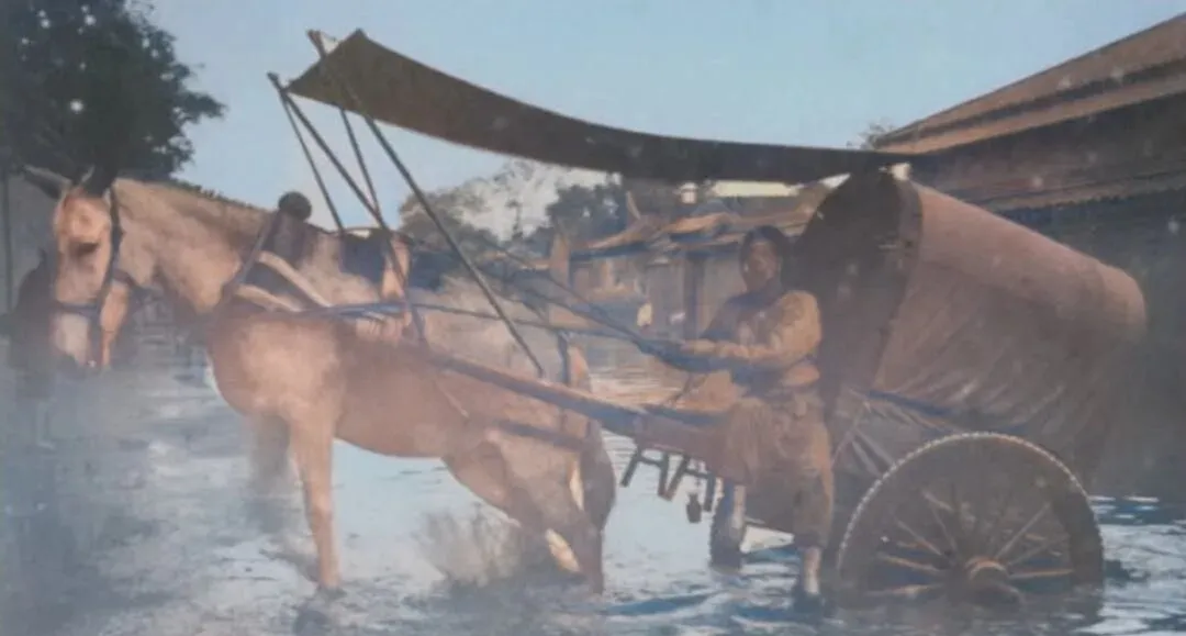 这张别错过,雨季里驴车拉着布篷,车夫身子往后一坐,双缰一抖,驴腿在水里蹚得起浪花,篷里估计是柴米布匹,车辙在水下看不见,靠耳朵听轮子咯吱咯吱,等出了水面才敢快点赶路,现在我们嫌路上堵,回头看看,曾经连路都没影,只剩一条水脊梁。