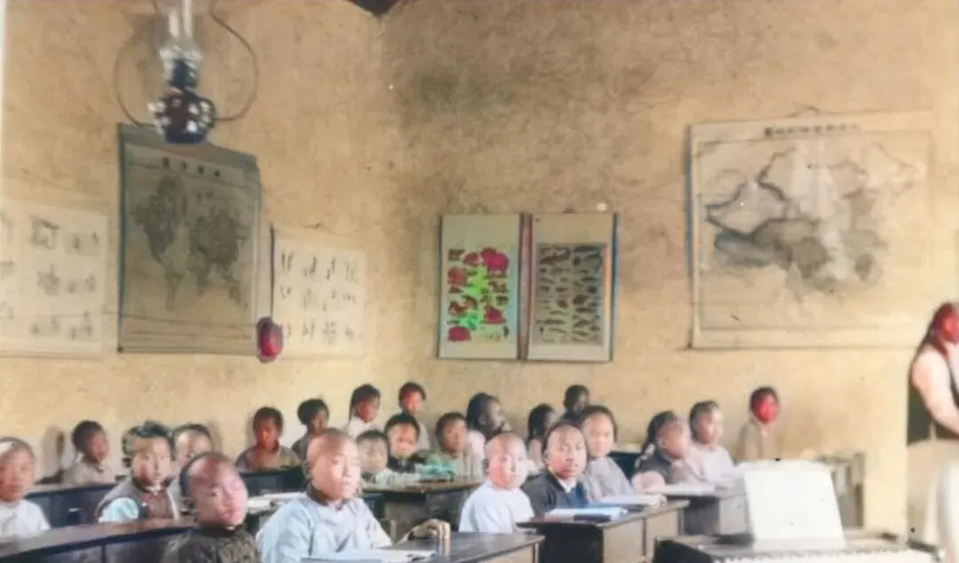 这个小屋是课堂,泥墙糙糙的,墙上挂着中国地图、世界地图和一张动物图,孩子们坐长条桌,脑袋一个挨一个,油灯吊在梁上,老师站在一侧,手里捏着粉笔头,写字不直不歪,妈妈看见这张说,当年她也这么坐过,冬天冷得手指发硬,念到“黄河长江”,心里却热乎乎的。