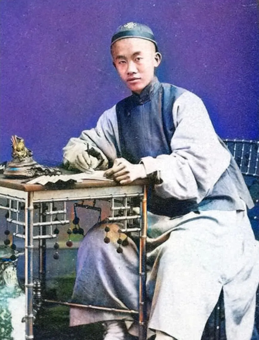 这个年轻人叫张德彝,清末的翻译家和外交通官,照片里他穿青灰长袍,桌子是竹节样的金属管拼成,角上还坠着小串珠,手里拿着笔,面前摊着信笺,听先生们讲,他是光绪皇帝的英语老师,每周两次进宫讲课,词儿不多,句子要准,他给皇上讲西方的邮政铁路,讲到“parliament”,干脆写下汉字旁标音,利落得很,现在我们学外语有录音有APP,那时全靠耳朵和脑子。