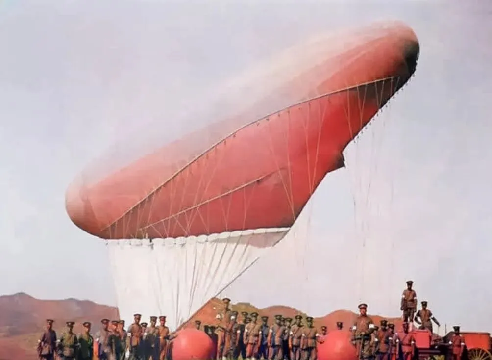 这个大个头叫探测气球,红彤彤的肚子鼓在天底下,绳索一根根吊着,下面一排新军顶着帽沿站好,操演时要把气球拽上去,再放,风向合不合,要有人盯,降下来还得几个人合力抱住脖颈,不然蹭地跑了,后来有了飞机和电台,气球退了场,可在那会儿它就是天上的眼睛。