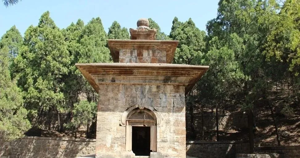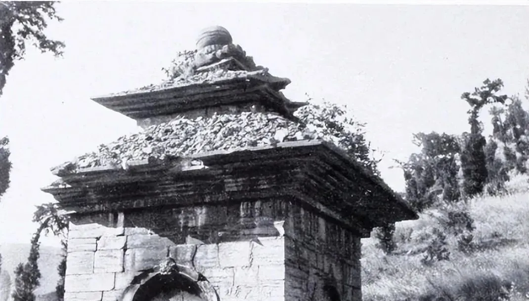 这个方形小塔叫慧崇禅师塔,天宝年间修的,塔檐一层一层叠斗,顶上那颗圆钮像扣在帽子上的珠子,1884年塌了一回,照片里檐角早有裂纹,石缝里竟冒着些野草,硬朗得很。