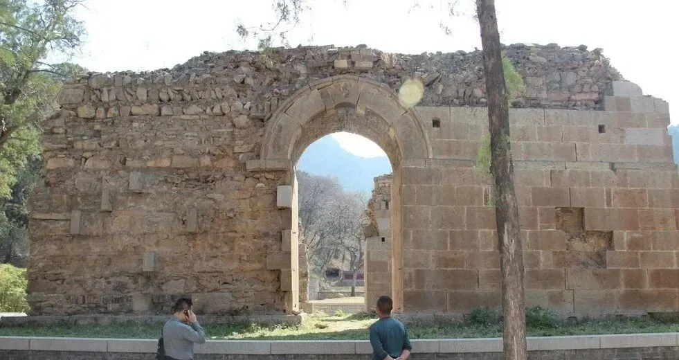 这堵半腰的墙是旧山门,中间半圆券,石料粗细不一,像临时拼的,可门楣那圈线条收得紧,工匠的规矩在这儿一眼就看见了,现在多是刷大白的新门,干净利落,却少了这种手上劲儿留下的味道。