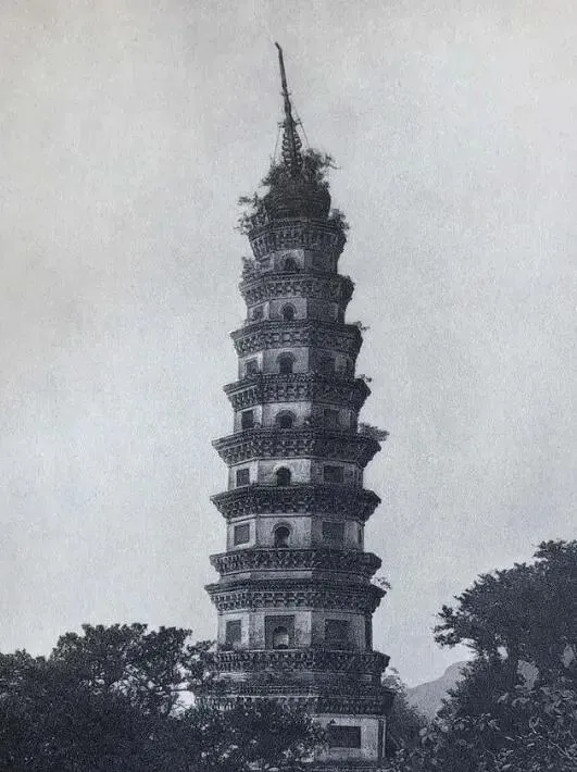 这张看得更清楚,塔座厚重,腰檐鼓起,窗洞像一张张小口子,风从里头穿过去,照片上头尖处还插着一根长长的铁杆,顶端的相轮残缺了几瓣,时间悄悄把它磨薄了。