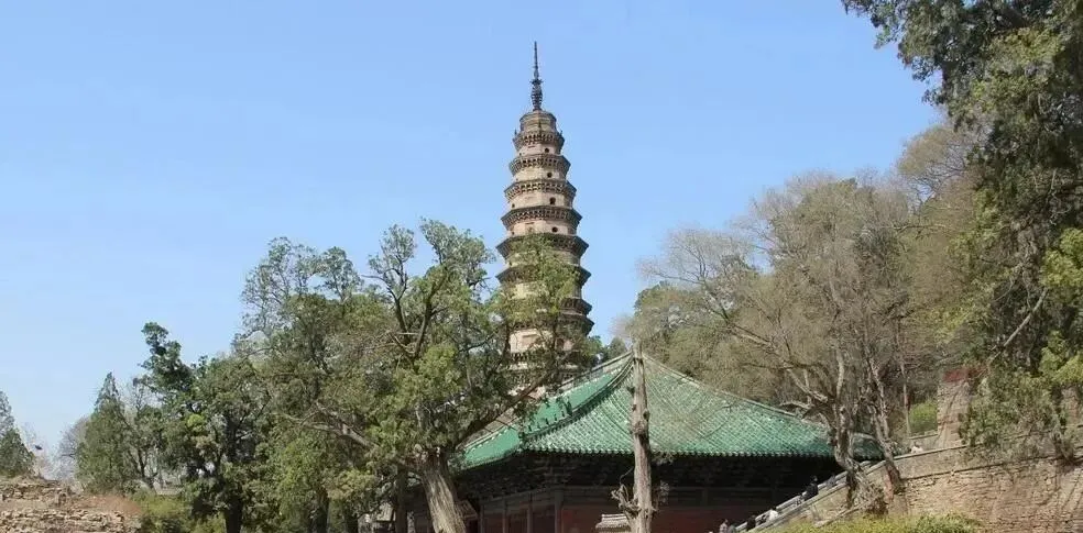图中那面如刀削的高台叫方山,四面峭直,顶上平整,老辈人又叫它玉符山,脚下这片沟谷便是灵岩峪,拍照的人站得远,山脚树影压着,塔尖从林梢里探出头来,可精灵了。