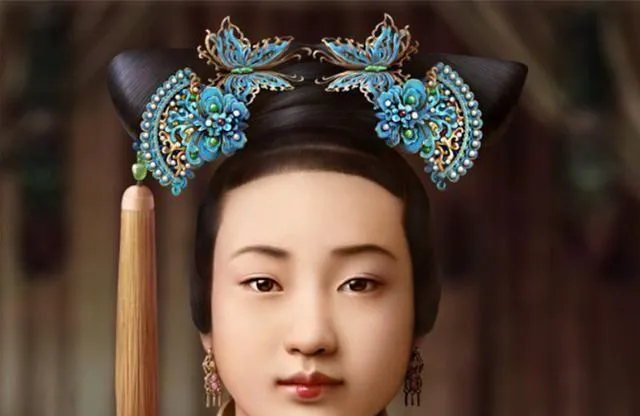这个发式展开像两只蝶翼,边沿嵌着蓝色小花和点翠,亮得很,脸是圆润的,嘴角没笑却不冷,难怪有人说这张真是好看,我妈凑过来瞧了一眼,说年轻时候她爱看这种簪花的细活,做起来手得稳,针线要细,还要会配色,不是乱堆,小时候我跟在旁边看她串珠,线一拉一松,桌上掉下去的亮片叮的一声,声音现在还记得,那时候讲究细,现在讲究快,味道就不一样了。