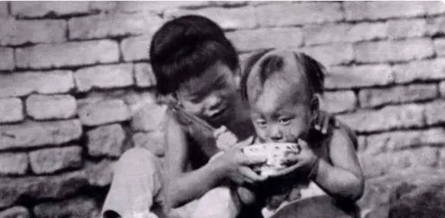 图中两个瘦伶伶的小孩端着一只碗,这个场景叫街口打牙祭也不沾边,只是讨口温饱,碗是粗瓷的,边上磕掉一块,墙是土坯的,风一刮就掉渣,孩子眼神往下缩着,像怕光又像怕人,姐姐把胳膊搭在弟弟肩上,手指甲里全是黑泥,碗里能见到的不过是几口清汤,喝一口喘一口,冻得直抖。